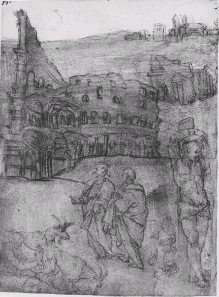 Many of the busy mythological drawings in this sketchbook, 1535, are of subjects taken from ancient sculpture, and probably inspired by works of art seen in Rome.
