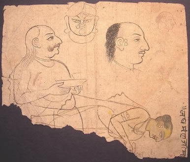 | Families of artists pass sketchbooks onto the next generation of painters in the town of Nathadwara, Rajasthan, India. Artists’ notes fill the books with drawings on both sides of one sheet of paper and overlap with ideas. Sons and daughters work in the family workshop to learn painting skills from family members. The finished paintings depict scenes from the life of Krishna. Contemporary. Pencil, gouache, and ink. Artists: From Nathadwara a small town in India. See the book, The Artists of Nathadwara: The practice of painting in Rajasthan, Trina Lyons, (google preview). |