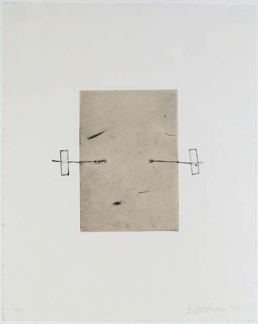 “The artist plays on the construction of wire-bound sketchbooks, setting up an image of exquisite tension, with the fragile paper being held taut by the two extended wires” (description from National Gallery of Canada). 1974. [Etching with wire and scotch tape on japan paper laminate on wove paper.]