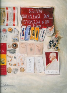 This artist fills books with found materials that include traces of the food she eats, items from the natural world and from places she visits. She makes notes about where things are found, eg. dust from the Vatican basilica. She also sketches from the items she collects.