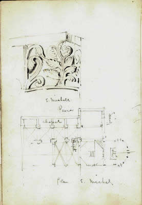 | Architectural sketches done during a tour of Italy by architect Charles Mackintosh, 1891, contain careful pencil studies of exteriors, and a few interiors, capitals and floor plans. Materials, and sometimes measurements and sculptures, are included in his notes. Pencil. Artist: Charles Rennie Mackintosh More pages online, Archives and Collections, Glasgow School of Art. |