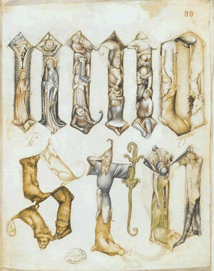 Illuminated letters of the alphabet (with animals and people), and brilliant wash drawings of cheetahs, stags, rabbits, and people, etc., for children and to flourish texts, fill the sketchbooks of Giovannino de Grassi. De Grassi was a Visconti court artist, painter, and sculptor, which allowed him an education, and sources for work, thus an income. c.1390.