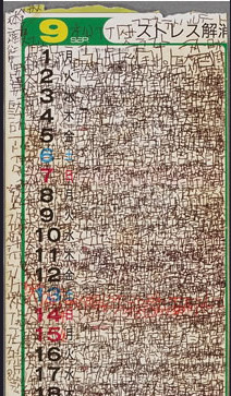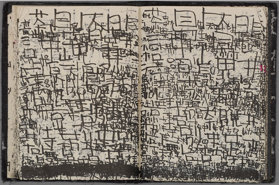 | The artist, Kunizo Matsumoto, fills notebooks and the pages of calendars with writing about the arts he likes; from classical Japanese operas to contemporary animated movies from the U.S. The layered writing, in various sizes and intensity on both sides of the page leaks through and creates a visual rhythm. The finished piece is a book by the artist. Contemporary. Ball point pen and markers on assorted paper. Artist: Kunizo Matsumoto. |