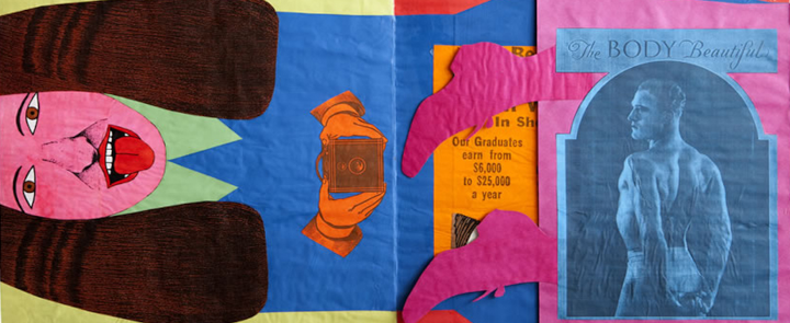 | Larry Lewis (1919-2004) worked as a secretary at United Oil Products, in Connecticut, USA. His sketchbooks were done in private, shown only to a few people. ‘He hand inked and painted brilliantly colored pages of ledger books and then created collages from photocopies of collected Victorian ephemera, images of movie stars from the 1920’s and 30’s and newspaper ads. ‘Each page and spread [was] composed as a painting unto itself,’ sometimes with cut out fold outs. ‘He made larger books by hand’ when needed. He never finished any of his books. ‘He worked randomly and haphazardly through each one.’ Larry’s many sketchbooks were discovered after he died. Artist: Larry Lewis Website: The Extraordinary Collages of Larry Lewis Text and images copyright Sharyn Prentiss Laughton, 2022. Used with permission. |