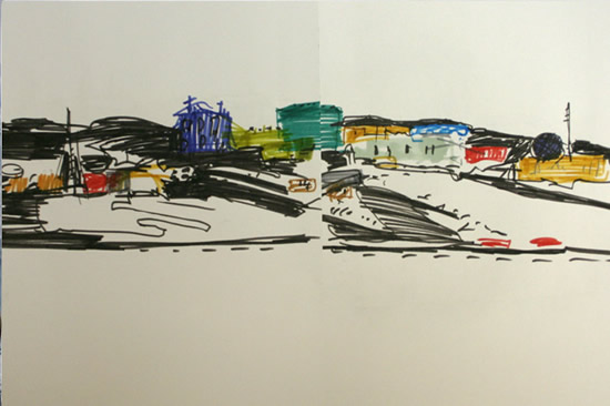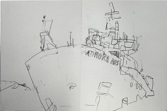 | Drawings were done before, during, and after a ship journey to Australian territories in Antarctica by the artist, Nick Hutcheson. His trip involved a class room of students in Victoria, Australia, who journey with him through his web site. For 8 weeks Hutcheson drew from observation, the ship, stations, the people he met, various landscapes of rock, sea ice, and mountain peaks, and elephant seals, penguins, and studies of earlier explorers. Drawing South (the web site) provided his visual, and written, observations, and what his work leads to after his trip. 2008. Graphite pencil, color pencil and felt pens. Some drawings on acrylic ground. Artist: Nick Hutcheson. |