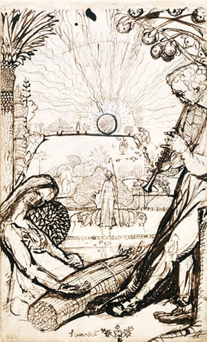| These mystical and visionary sketches, from a notebook, are the combination of studies by the artist, compositions and writings from imagination and direct observation. The artist is 19 at the time and greatly influenced by mystical artists and writers, and the naive. These ideals are transfered to his paintings. After his death this is the only early sketchbook to survive destruction by his son, to protect his father’s reputation as a landscape painter. Early to mid 1800s. England. Brown ink, graphite, and watercolor. Artist: Samuel Palmer. See the book, Samuel Palmer: The Sketchbook of 1824, by Martin Butlin (Editor), William Vaughan (Foreword by) for more images. |