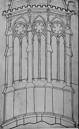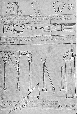 Various models for sculpture, architecture (building techniques), and mechanical devices, for industry and war, appear in this book made by the master stone mason, Villard de Honnecourt, in Medieval France. Religious and secular figures suitable for sculpture are also included, along with architectural plans, elevations, details, ecclesiastical objects with many notes made (animals and people also). His drawings of the Laon cathedral bell towers and the Reims cathedral nave, provide possible building techniques of High Gothic architecture. 1220 or 1230.